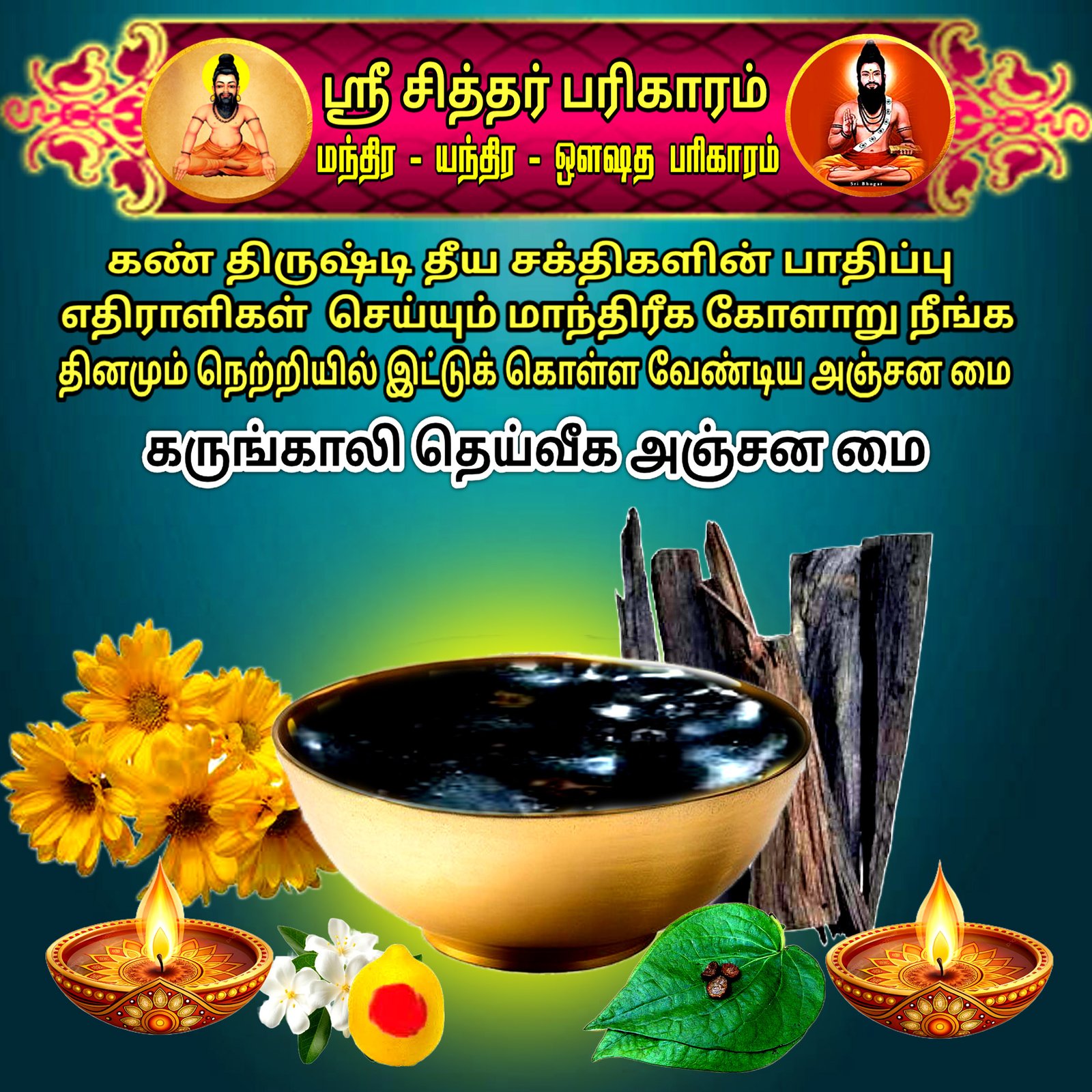 போன்ற தெய்வீக மூலிகைகள் மற்றும் வசிய பொருட்களால் அஞ்சன மையாக தயாரித்து மந்திர உரு சக்தி ஏற்றப்பட்டது பயன்படுத்தி பலனை அடையுங்கள்