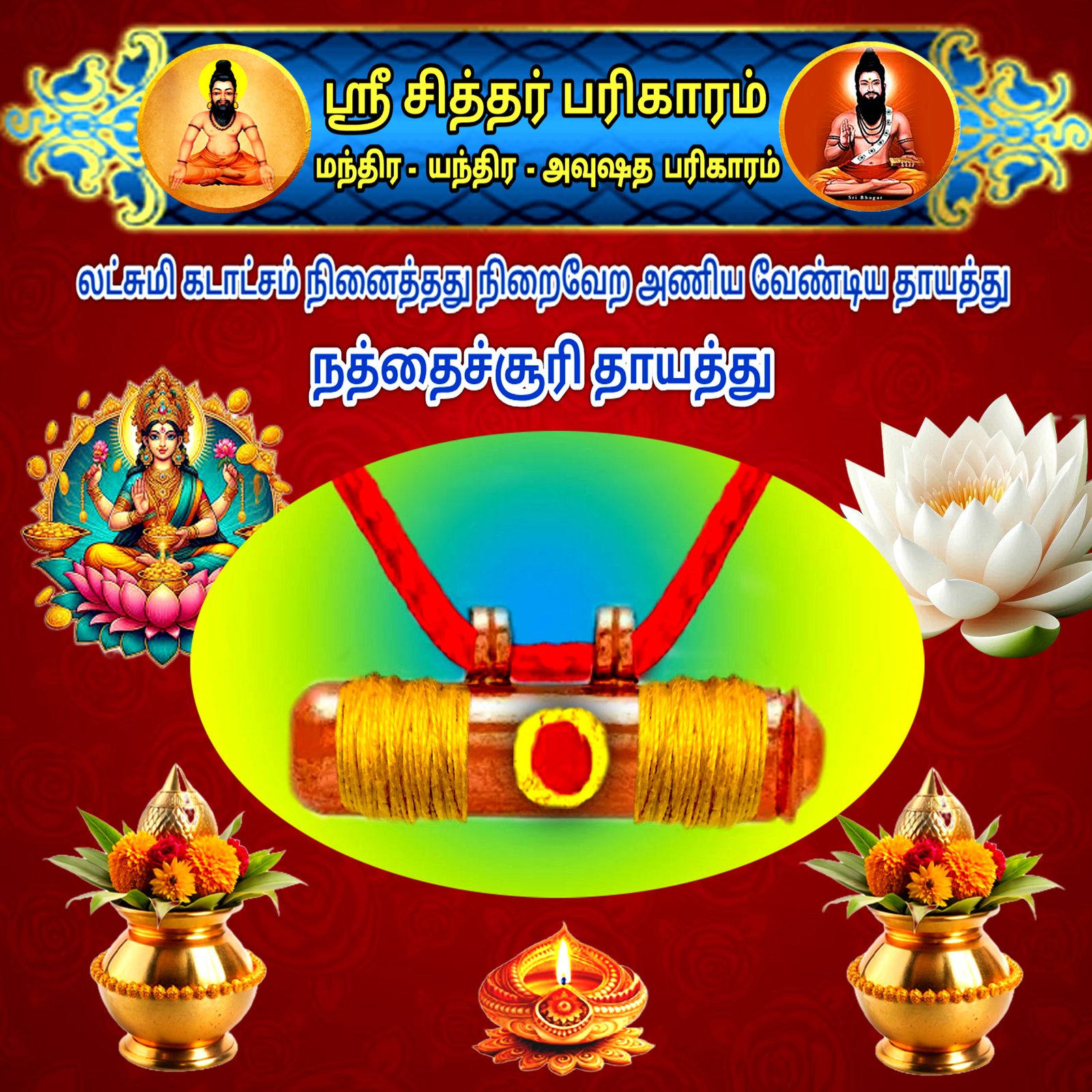 நத்தைச்சூரி வேர் + லட்சுமி யந்திரம் + நத்தைச்சூரி அஞ்சன மை பூஜையில் வைத்து மந்திர உரு சக்தி ஏற்றப்பட்டது