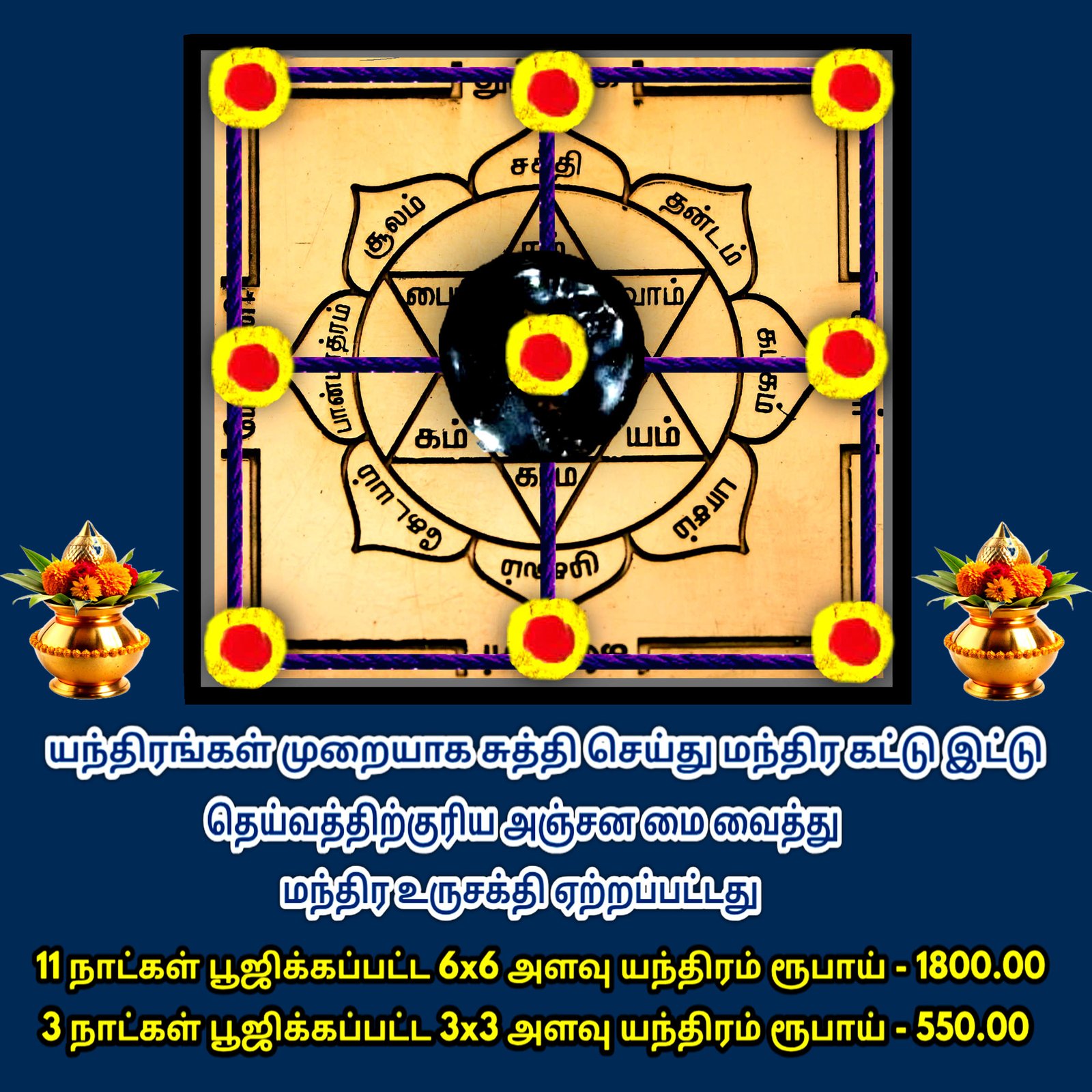 11 நாட்கள் பூஜிக்கப்பட்ட 6×6 அளவு யந்திரம் ரூபாய் – 1800.00 3 நாட்கள் பூஜிக்கப்பட்ட 3×3 அளவு யந்திரம் ரூபாய் – 550.00