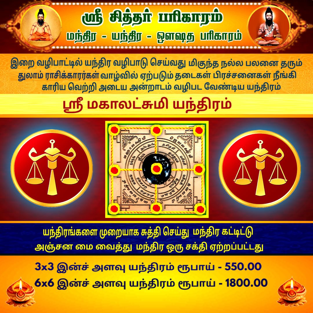 இறை வழிபாட்டில் யந்திர வழிபாடு செய்வது மிகுந்த நல்ல பலனை தரும் துலாம் ராசிக்காரர்கள் வாழ்வில் ஏற்படும் தடைகள் பிரச்சனைகள் நீங்கி காரிய வெற்றி அடைய அன்றாடம் வழிபட வேண்டிய யந்திரம்