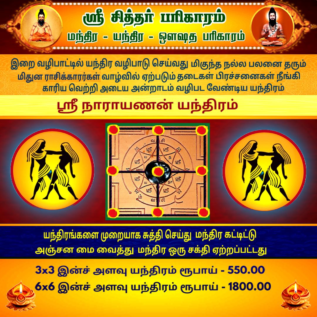 இறை வழிபாட்டில் யந்திர வழிபாடு செய்வது மிகுந்த நல்ல பலனை தரும் மிதுன ராசிக்காரர்கள் வாழ்வில் ஏற்படும் தடைகள் பிரச்சனைகள் நீங்கி காரிய வெற்றி அடைய அன்றாடம் வழிபட வேண்டிய யந்திரம்