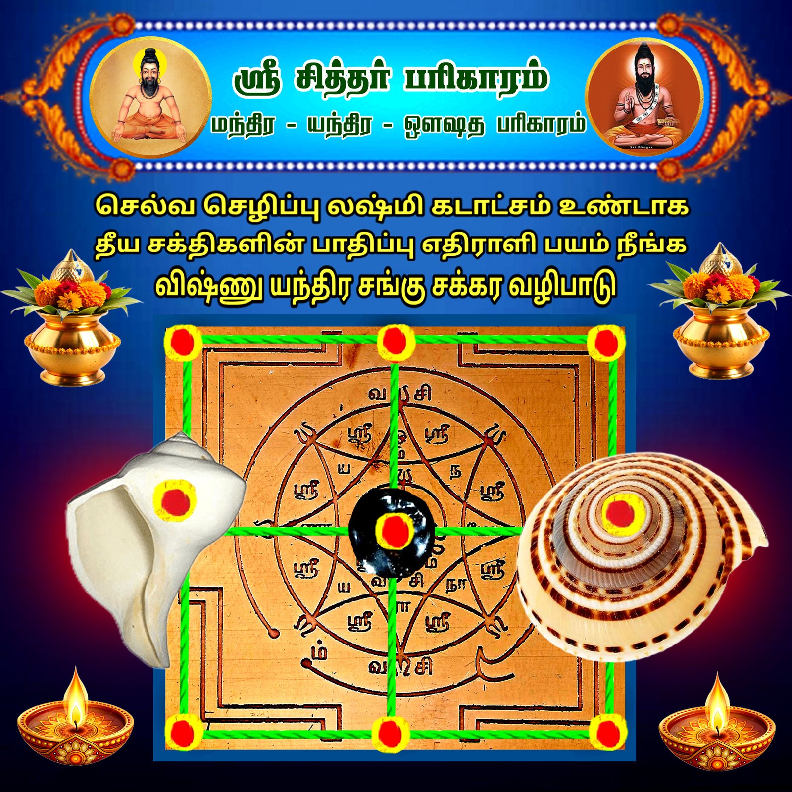 3×3 யந்திரம் + 1 inch சங்கு + 1 inch விஷ்ணு சக்கரம் – ரூபாய் – 1800.00 6×6 யந்திரம் + 3 inch சங்கு + 3 inch விஷ்ணு சக்ரா – ரூபாய் -3000.00