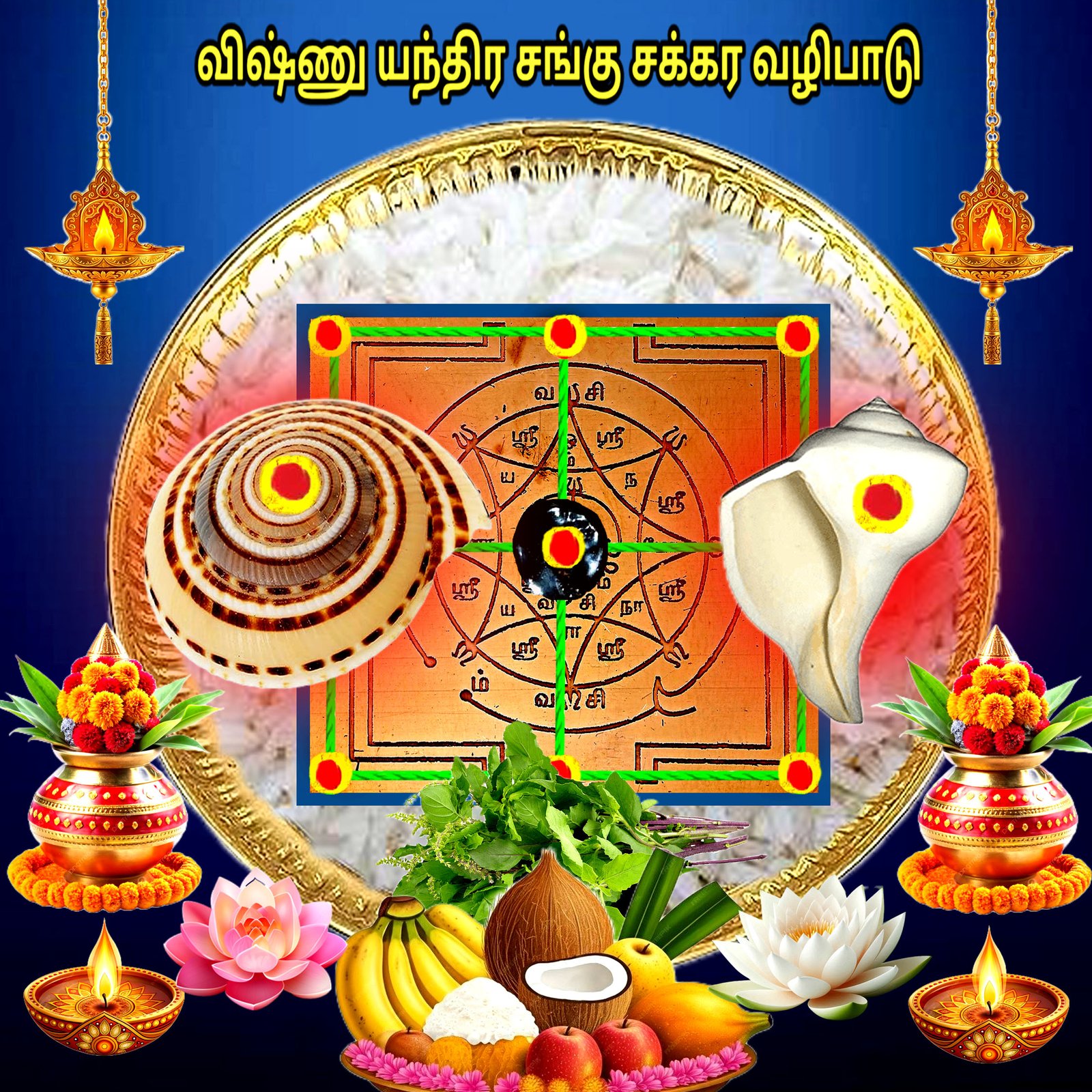 செல்வ செழிப்பு லஷ்மி கடாட்சம் உண்டாக தீய சக்திகளின் பாதிப்பு எதிராளி பயம் நீங்க விஷ்ணு யந்திர சங்கு சக்கர வழிபாடு